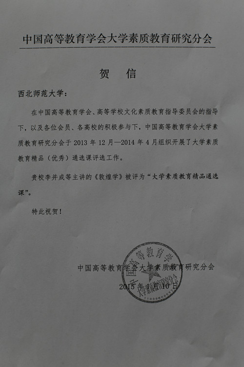 在中国高等教育学会大学素质教育研究分会2013年12月——2014年4月组织的大学素质教育精品(优秀)通选课评选中,欧博李并成研究员等主讲的《敦煌学》被评为“大学素质教育精品通选课”。
