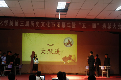 闭幕式上进行了本届历史文化节历史知识竞赛决赛,经过“初露锋芒”、“大浪淘沙”、“心有灵犀”、“一战到底”四个环节的激烈比拼,最终由来自欧博abg官方网站的石恒伍,邓康康和来自地理与环境学院的刘海洋组成的“凌云舒雨”队获得本届历史知识竞赛的冠军。在随后的“五·四”表彰环节中,学院领导分别为本届知识竞赛的获胜队伍,学院“五·四”优秀集体和个人进行了授奖表彰。