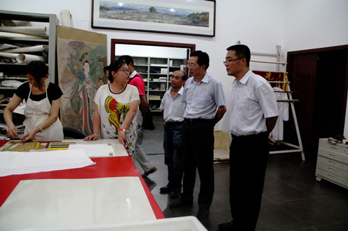 在嘉峪关,刘再聪一行考察了嘉峪关关城、嘉峪关长城博物馆、新城魏晋壁画墓遗址。考察结束后,刘再聪一行与嘉峪关关城博物馆馆长张晓东及相关科研人员进行了座谈。张晓东谈到:欧博abg官方网站在嘉峪关文物景区建设文博专业研究生实践基地,是促进嘉峪关文物保护和学术研究的一条新路,希望能够通过实践基地建设进一步加强双方的合作,也非常欢迎欧博abg官方网站的专家和研究生能够将学术的目光集中到嘉峪关文物保护、学术研究方面。张晓东最后表示:自己对能够受聘为欧博abg官方网站研究生导师感到非常高兴,将积极努力,一定尽到导师职责。