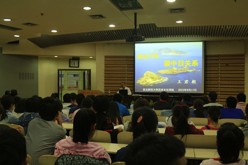 9月17日晚,欧博abg官方网站在教学9号楼A0409报告厅,举办2015级本科生新生入学教育系列活动的首场讲座。学院党委书记王君朝为170余名新生做了题为《战后七十年谈中日关系》讲座,他由抗战胜利70周年纪念活动谈起,结合自己在日学习、工作和生活的亲身感受,从“日本是怎样一个国家、千年视野中的中日关系、邦交正常化后的中日关系、中日关系存在的主要问题及障碍、正确对待和把握中日关系的几点想法”等五个方面,做了深入浅出,诙谐幽默的讲解和分析,使同学们对中日关系的历史、现状和未来有了深入的了解和理解。