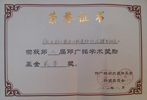 8月20-23日在杭州召开的“10-13世纪中国国家与社会”国际学术研讨会暨中国宋史研究会第十六届年会期间,邓广铭学术奖励基金评奖及颁奖仪式同期举行,欧博教师何玉红教授专著《南宋川陕边防行政运行体制研究》荣获第八届邓广铭学术奖励基金二等奖。