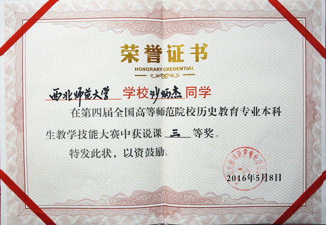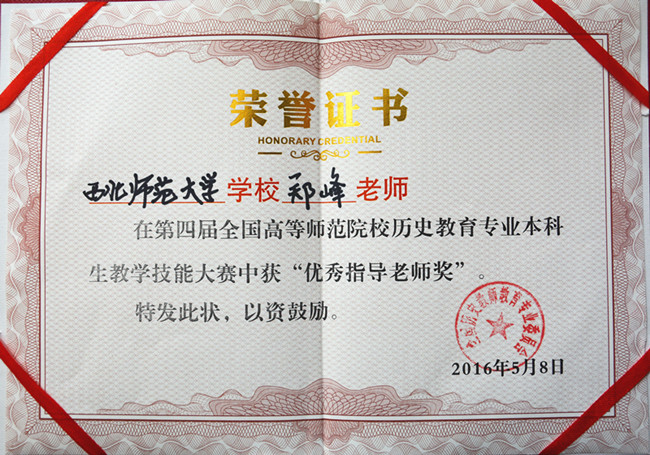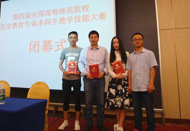 2016年5月7-8日,第四届全国高等师范院校历史教育专业本科生教学技能大赛在江西师范大学举行。来自华东师大、东北师大、华南师大、陕西师大和西北师大等76所高等师范院校的230余名学子参加了此次比赛。代表我校参赛的欧博abg官方网站3位本科生中2位获得赛事奖项,其中郑东娜同学荣获讲课二等奖,沙炳杰同学荣获说课三等奖。郑峰副教授荣获优秀指导老师奖。