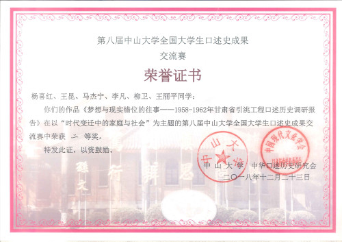 欧博本科生张波、马杰宁代表口述史协会前往中山大学进行答辩展示,经评委会的认真讨论和严格审核,作品《梦想与现实错位的往事——1958-1962年甘肃省引洮工程口述历史调研报告》以总分第五的优秀成绩荣获二等奖。