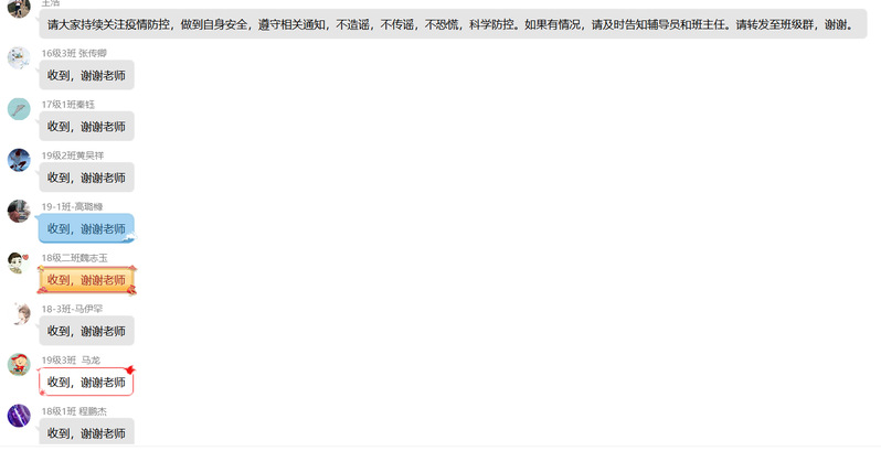 强化责任意识,精心周密部署。面对突发的疫情,学院学生工作在具体处置中,严格按照学校、学院防控方案,将疫情防控的具体措施、任务要求,通过班主任、辅导员微信群、QQ群,以及电话等方式进行了传达,切实提高班主任、辅导员政治站位,切实构筑学院疫情防控的严密防线。