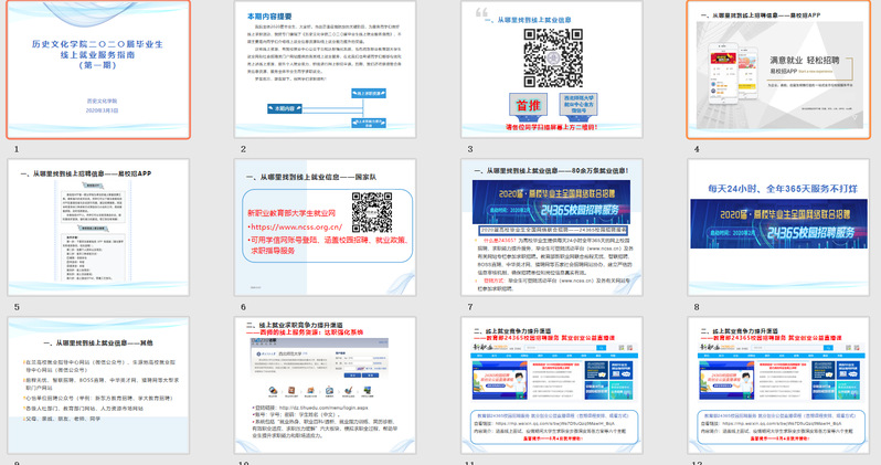 做好就业工作,开展“线上”服务。本次疫情的突袭恰逢毕业生离校求职的春季学期,在这个特殊时期,学院在毕业生服务工作中,坚持离校不“离线”的原则。坚持做好毕业生就业派遣信息的更新与录入。对毕业生中的家庭经济困难学生、“零就业”家庭学生等学生群体予以重点关注。并建立了毕业生就业信息QQ群,在该信息群中,学院辅导员结合学院专业背景,及时对历史学专业招聘信息,师范生招聘信息等进行发布。同时,为适应线上就业的实际情况,学院专门制作了《欧博abg官方网站二〇二〇届毕业生线上求职指南》,目前该指南已经连续制作两期,其中对各类优质线上就业指导资源、求职资源等进行了整理和汇总,并对毕业生在签约求职过程中要掌握的法律常识等进行了汇总。
