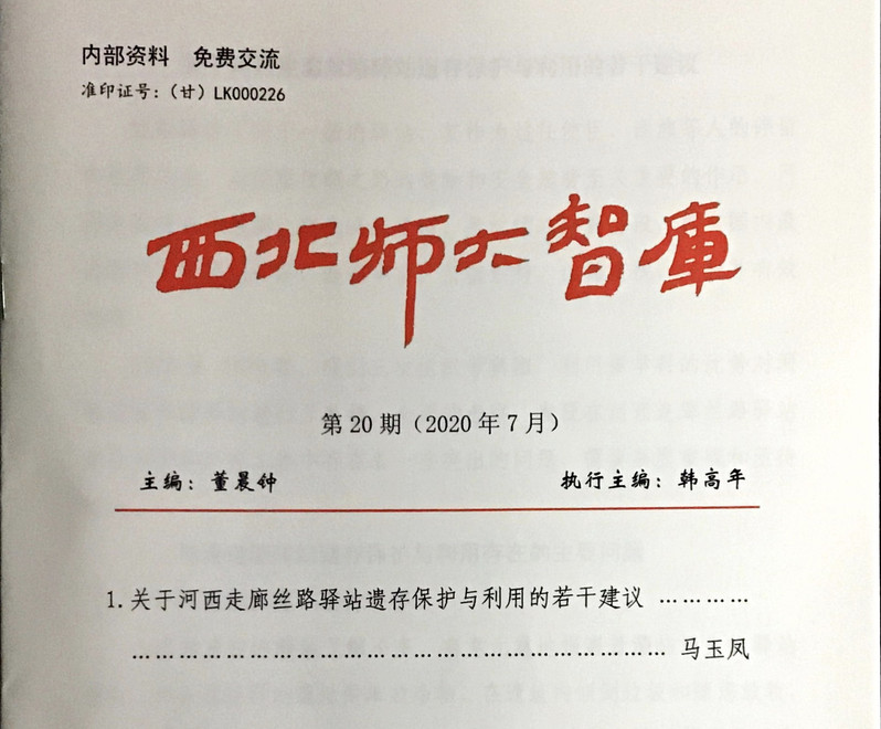 近日,由欧博马玉凤老师撰写的《关于河西走廊丝路驿站遗存保护与利用的若干建议》智库成果在《西北师大智库》第20期(2020年7月)刊登。