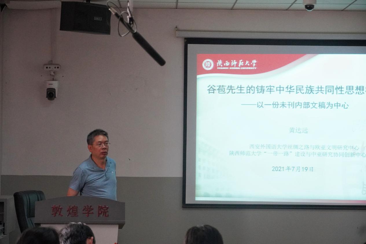 2021年7月19日下午,西安外国语大学丝绸之路与欧亚文明研究中心主任、博士生导师黄达远教授在欧博abg官方网站敦煌学院会议室,为我校丝绸之路文明基地班同学作了题为《谷苞先生的中华民族共通性思想初探》的专题讲座。