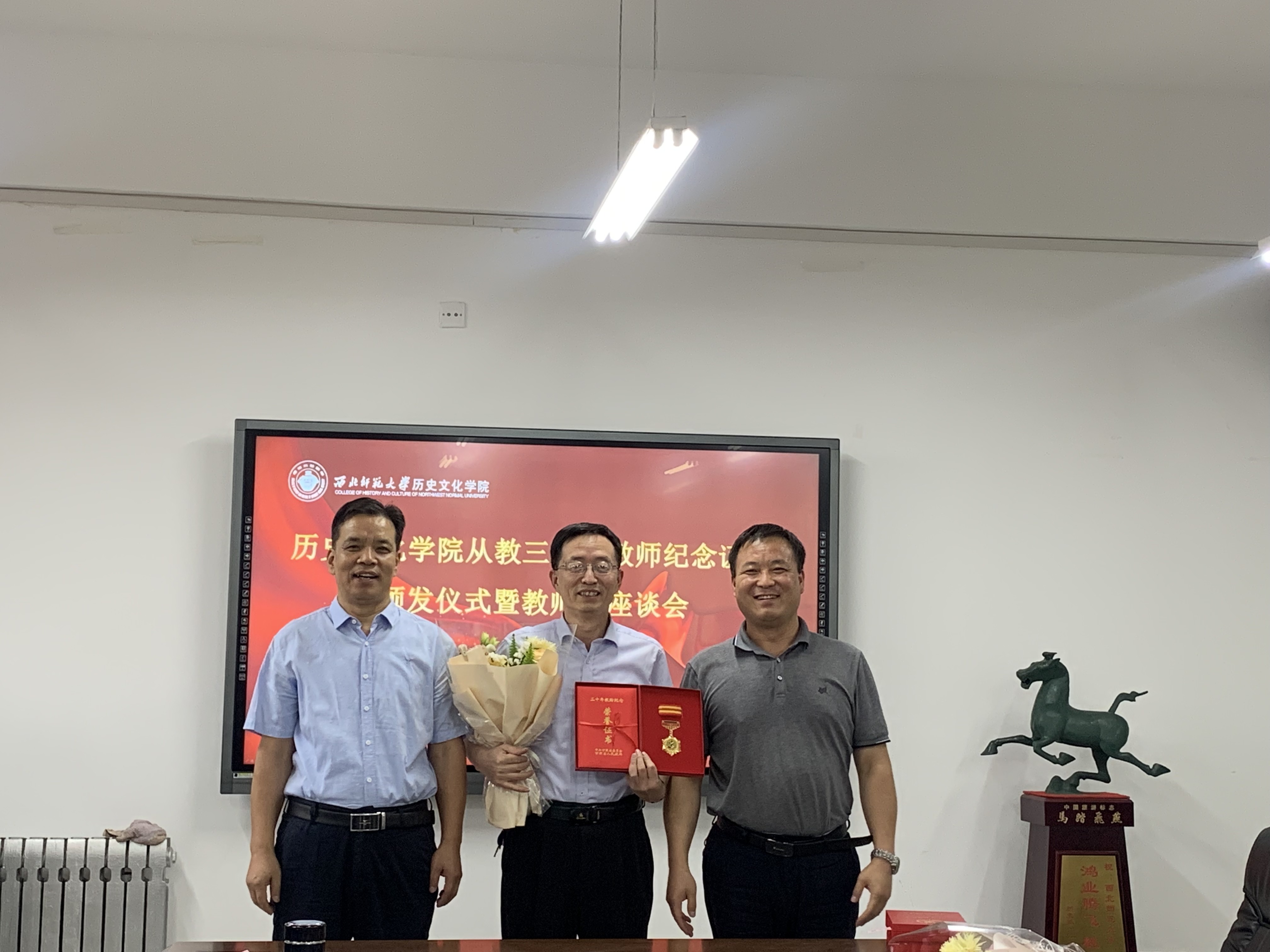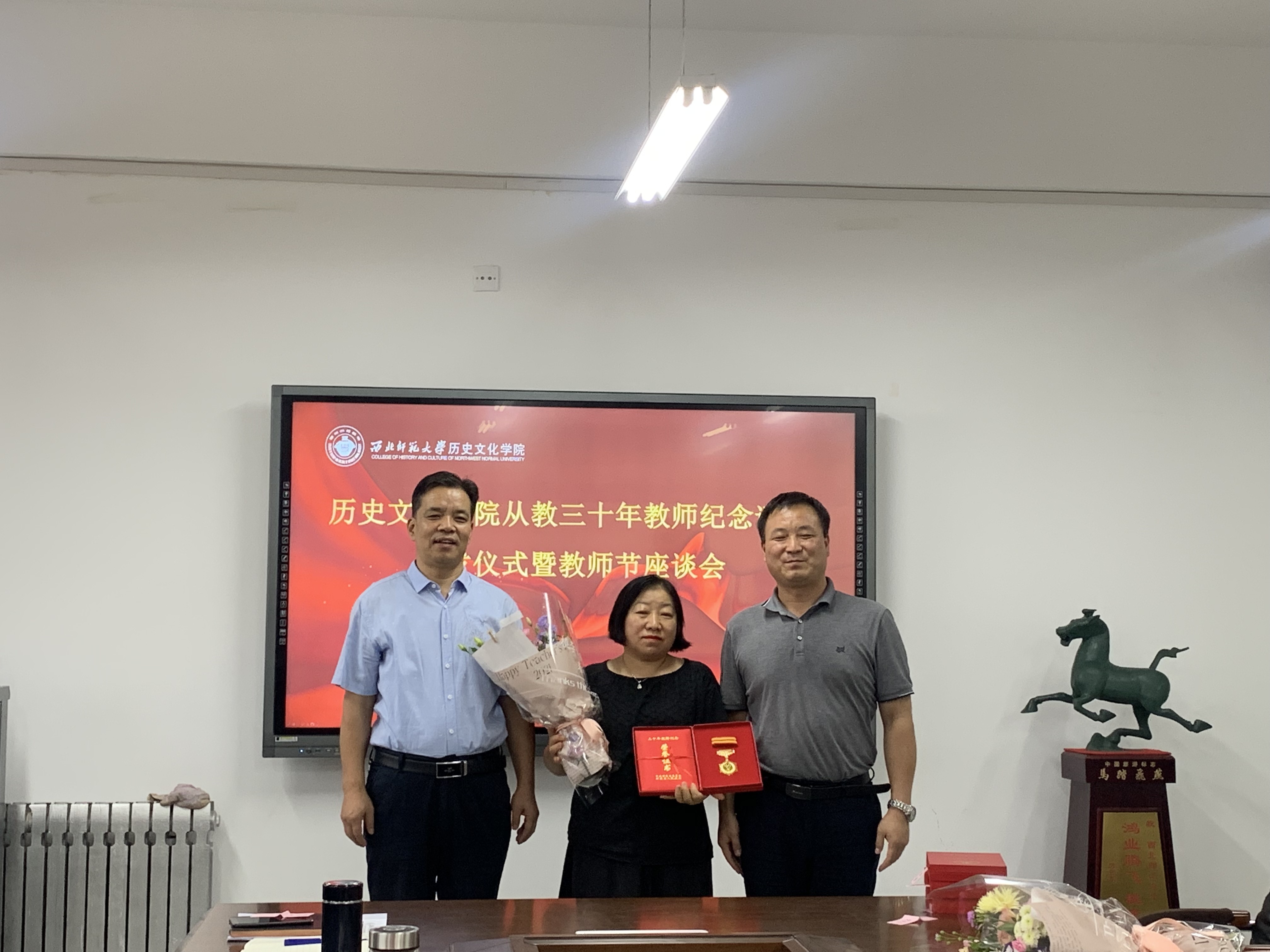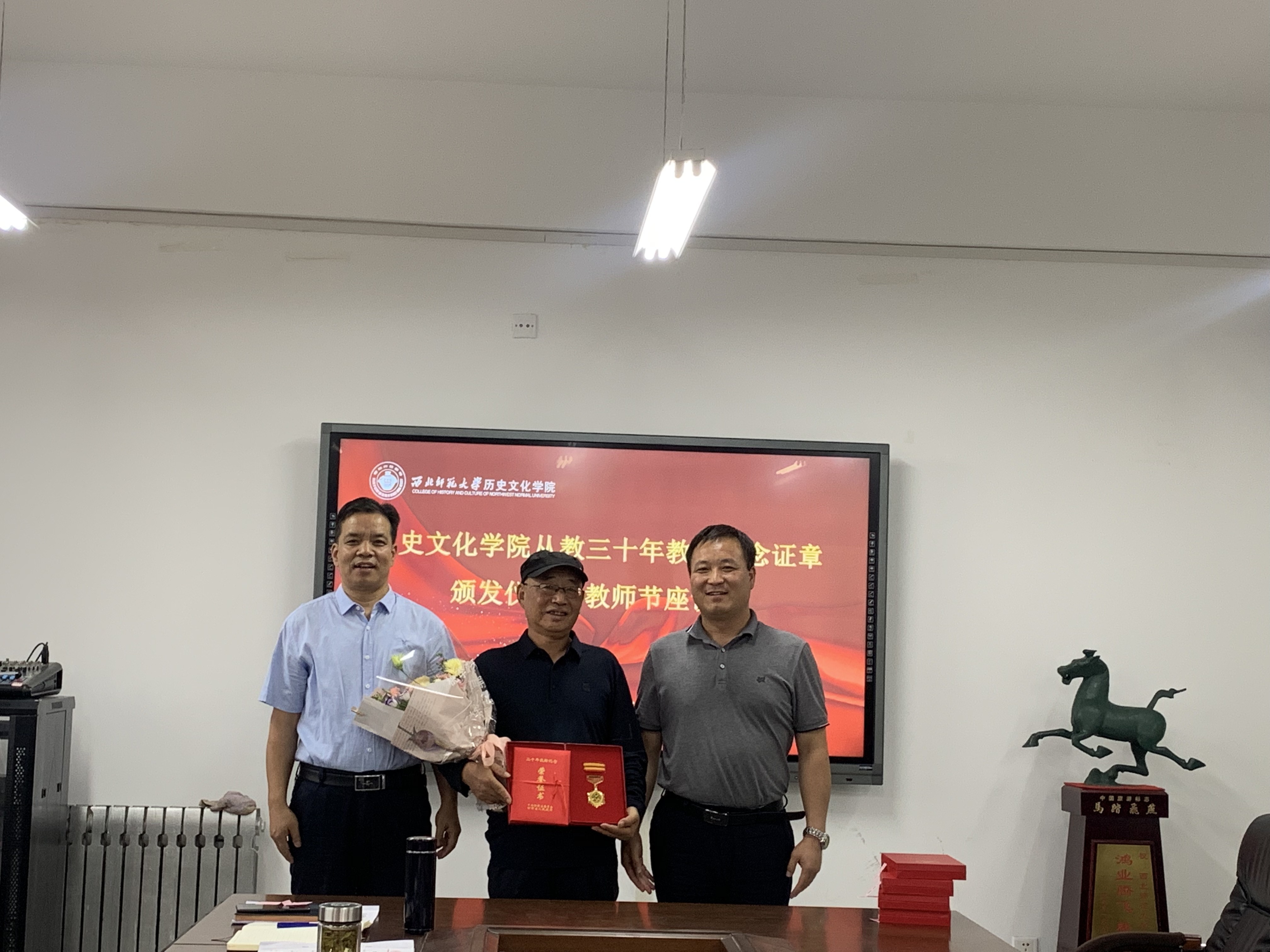 学院党委书记康智杰、院长何玉红为欧博从教逾30年的七位教师:李并成研究员、杨鹏飞教授、黄兆宏副教授、党庆兰教授、刘再聪教授、张玉霞副教授、张嵘副教授颁发了荣誉证书和奖章,并为光荣退休的陈秀实老师送上鲜花。