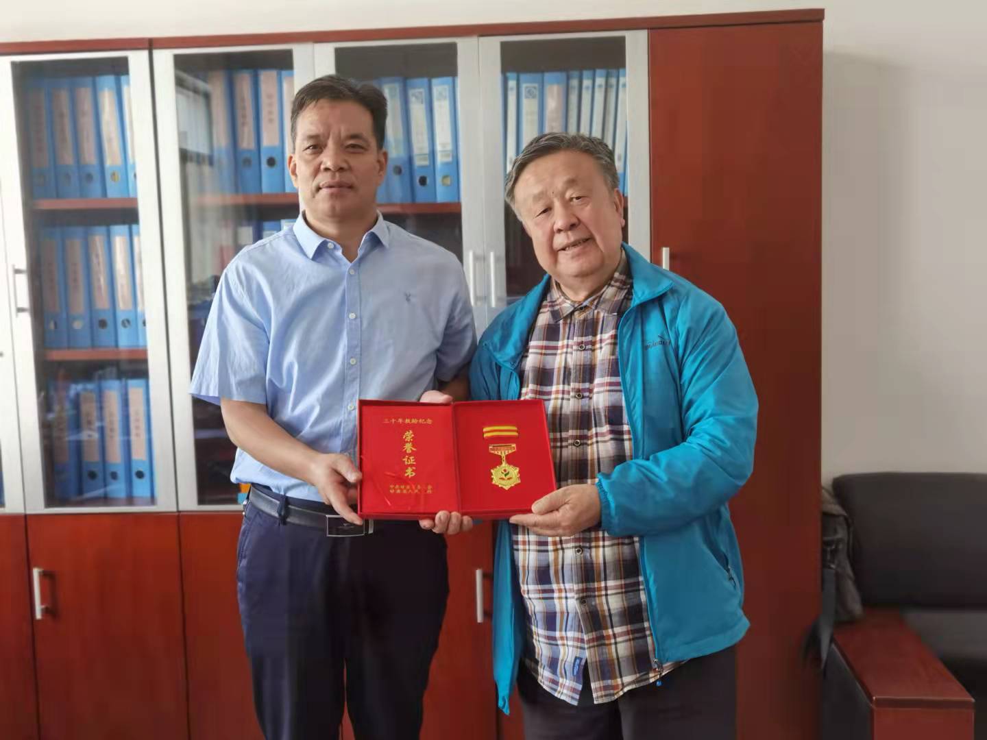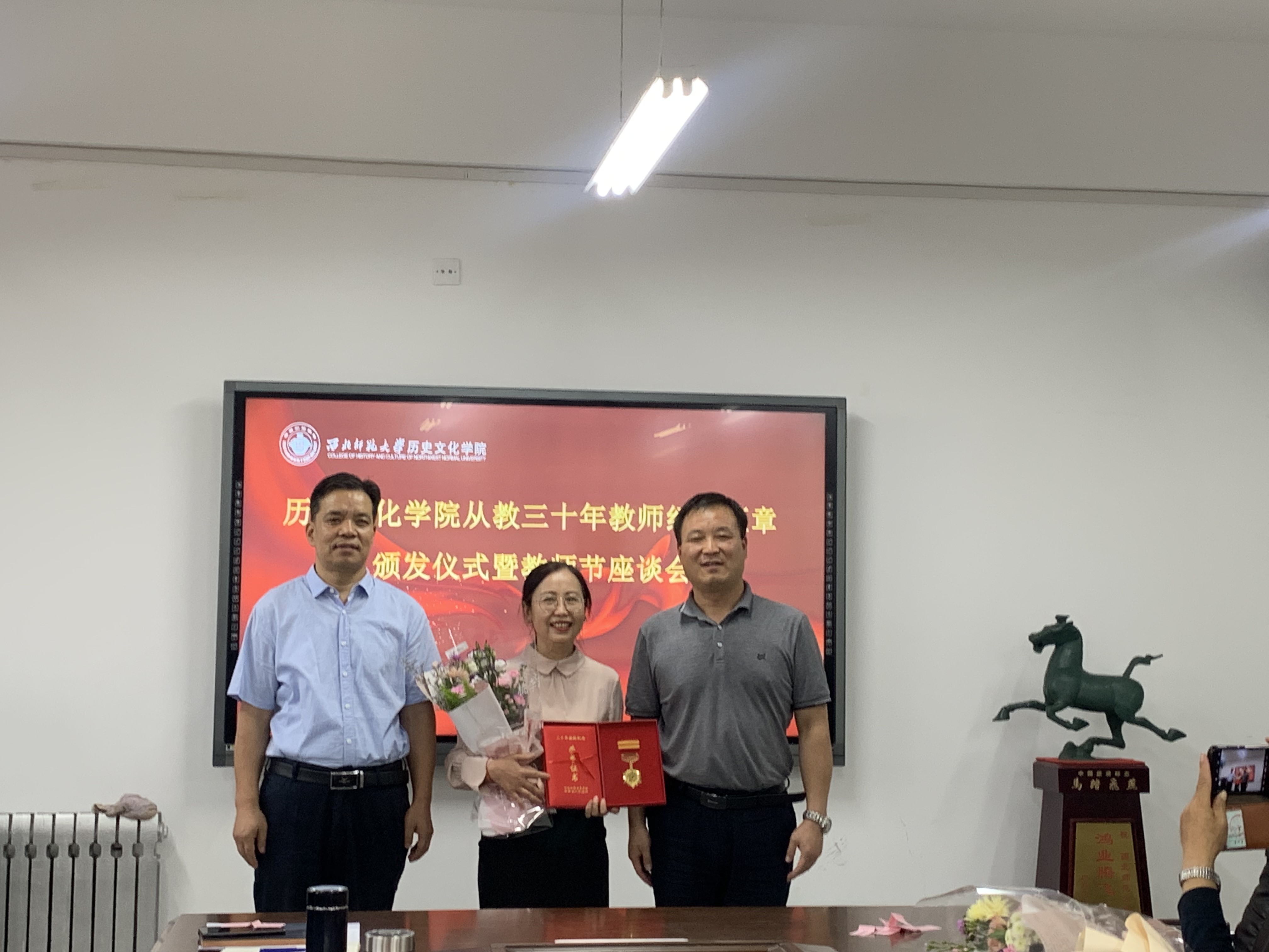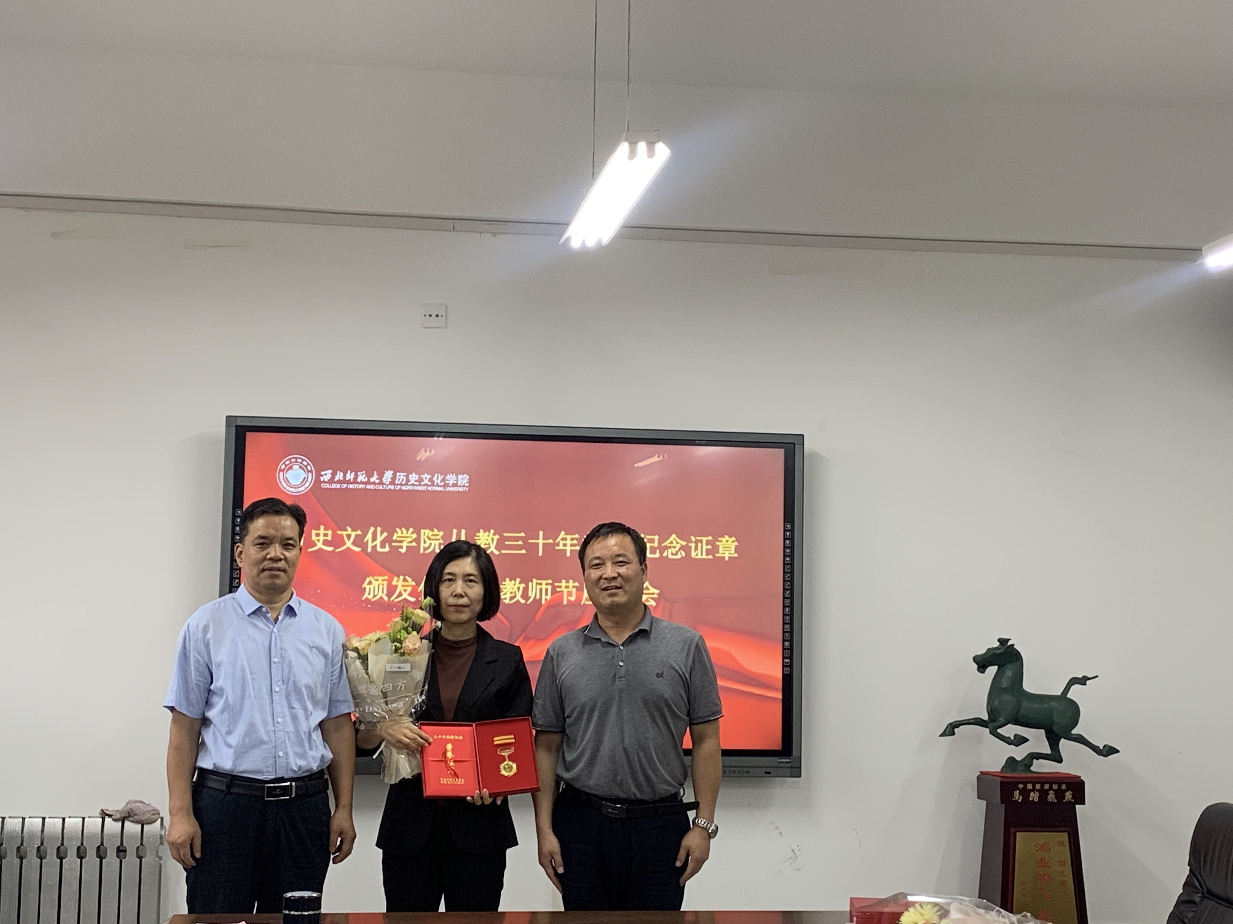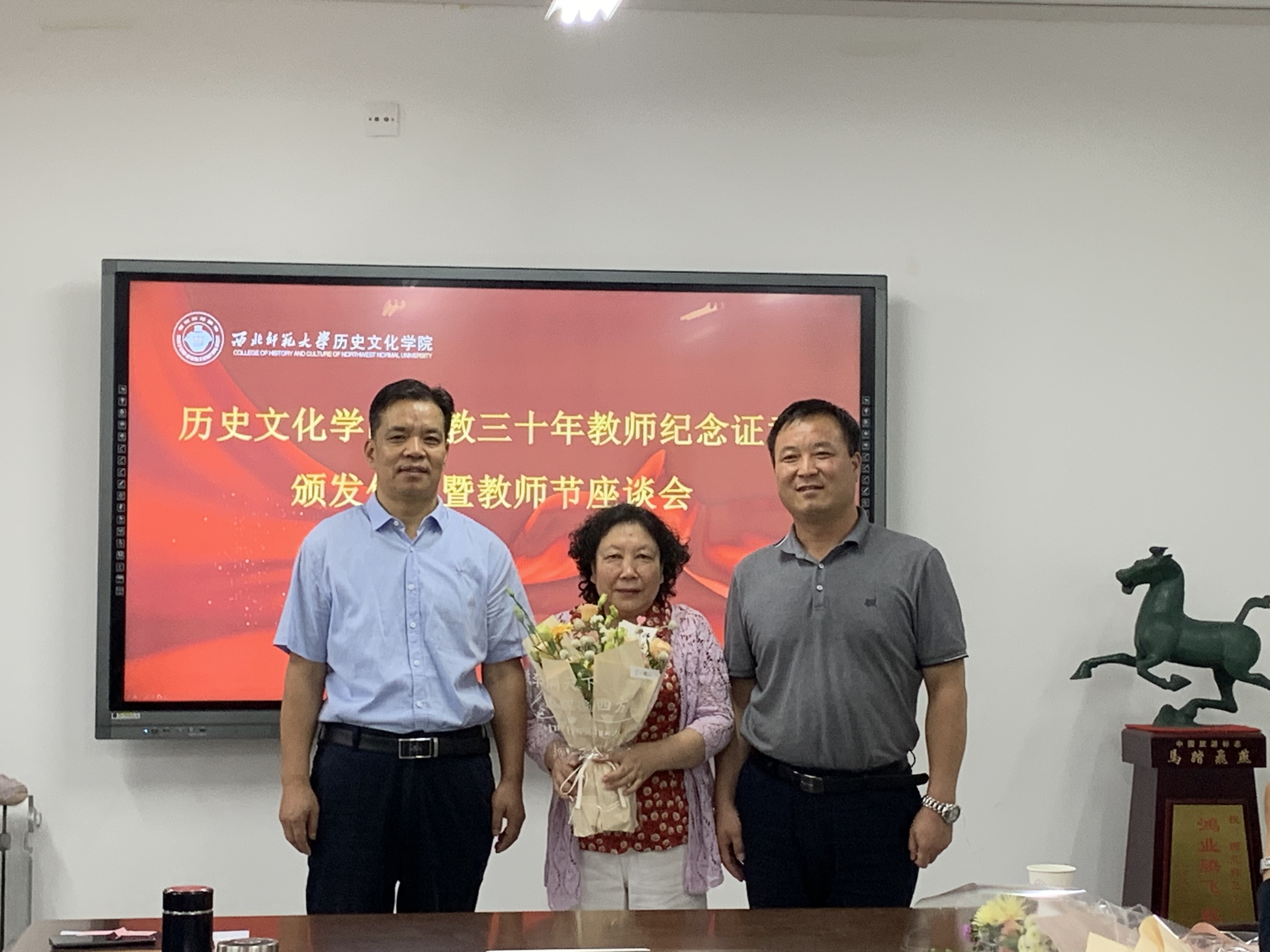 学院党委书记康智杰、院长何玉红为欧博从教逾30年的七位教师:李并成研究员、杨鹏飞教授、黄兆宏副教授、党庆兰教授、刘再聪教授、张玉霞副教授、张嵘副教授颁发了荣誉证书和奖章,并为光荣退休的陈秀实老师送上鲜花。