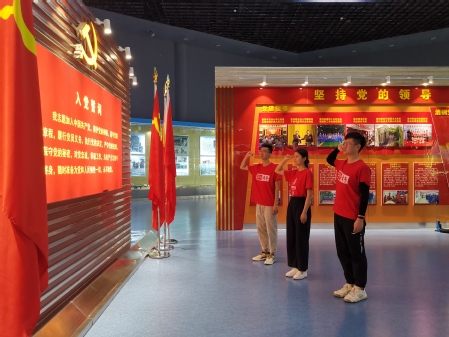 学习百年党史,追忆奋斗征程。7月19日上午,实践团师生走进酒钢展览馆,先后参观了酒钢建设发展历程展览和党史陈列展览。在酒钢发展建设成就展厅,实践团师生跟随讲解员通过观看专题宣传片、历史照片、实物资料、产品展示,深刻感受了“酒钢人”在艰苦环境中勇于献身、开拓前进的奋斗精神和发展振兴新中国工业的家国情怀。在参观完党史陈列室后,实践团队开展了以“追忆峥嵘岁月、感受大国力量”为主题的党史学习教育,全体党员面对鲜艳的党旗,重温入党誓词。誓言铿锵,激昂回响,更加坚定了青年学生党员听党话、跟党走的理想信念。