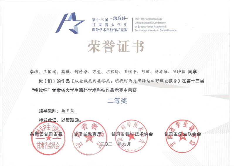 近日,欧博马玉凤副教授指导的《从金城关到嘉峪关:明代河西走廊驿站田野调查报告》在第十三届“挑战杯”甘肃省大学生课外学术科技竞赛决赛中获二等奖。马玉凤荣获“优秀指导教师”荣誉称号。