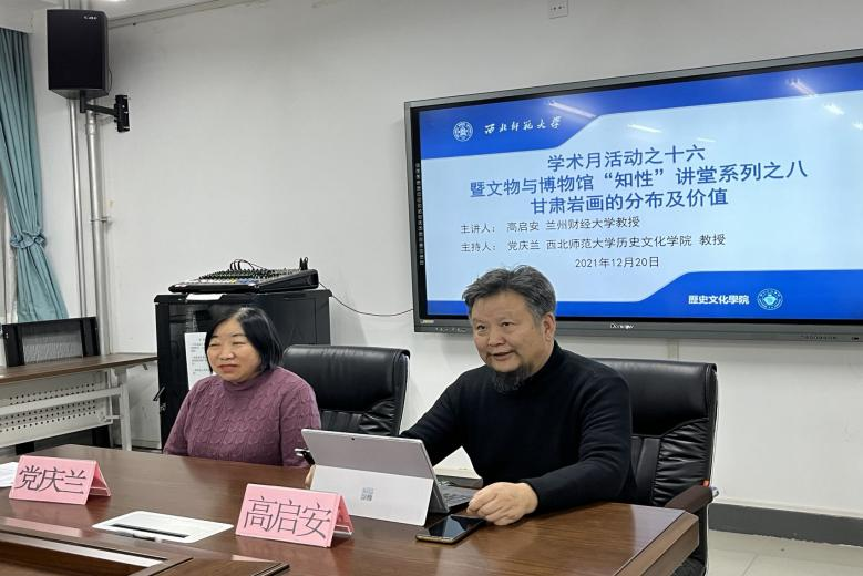 2021年12月20日下午2:30,应欧博abg官方网站邀请,兰州财经大学高启安教授作了题为《甘肃岩画的分布及价值》的学术报告,报告由欧博党庆兰老师主持,潘春辉、连菊霞、张荣老师及80余名研究生参加了此次学术报告会。