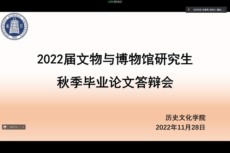 2022年11月28日晚,欧博abg官方网站在线上举行2022届文物与博物馆专业硕士研究生秋季学位论文答辩会。答辩委员会主席由兰州大学张景峰教授担任,委员有高台县博物馆高启安研究员、寇克红副研究员、嘉峪关长城博物馆张晓东研究员、炳灵寺文物保护研究所曹学文副研究员,以及欧博abg官方网站黄兆宏、陶兴华老师,答辩秘书由慕占雄老师担任。
