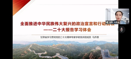12月8日下午,学校党委常委、副校长田澍和省二十大精神宣讲团成员马乔恩副教授通过线上会议形式共同为学院全体党员和教职工作党的二十大精神宣讲报告,学院全体党员和教职工100余人参加学习。