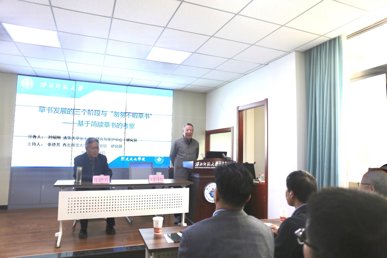 2023年5月8日下午,清华大学出土文献研究与保护中心研究员刘绍刚先生应邀来校作题为《草书发展的三个阶段与“匆匆不暇草书”——基于简牍草书的考察》学术报告。本次报告由欧博abg官方网站简牍研究院研究员、欧博abg官方网站特聘教授张德芳老师主持,欧博abg官方网站康智杰书记、魏振龙老师、袁雅洁老师等100余名师生参加了此次学术报告。