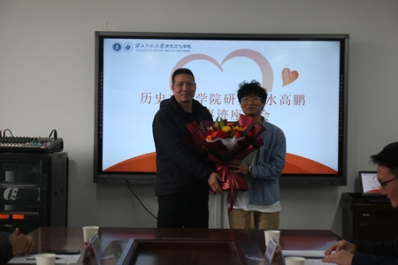 3月12日下午,甘肃省首例00后非亲缘造血干细胞捐献者、学院2023级硕士研究生水高鹏同学优秀事迹座谈会在田家炳教育书院310会议室举办。校团委副书记刘伟国、学院院长刘再聪、党委副书记王玉丰、副院长张继刚、副院长张连银出席,学院教师及学生代表50余人参加本次座谈。会上,水高鹏同学分享了自己的捐献经历,教师及学生代表分享了参加本次座谈会的感悟,刘再聪院长、刘伟国副书记分别作了讲话,刘伟国副书记、刘再聪院长、柳祥老师先后为水高鹏同学颁发荣誉证书、爱心慰问金和鲜花。
