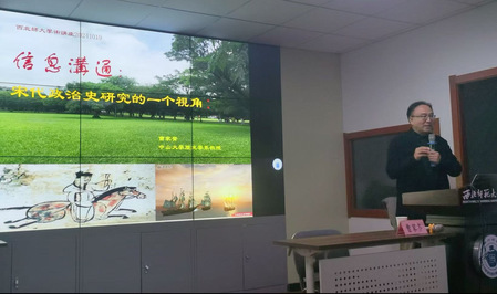 讲座伊始,曹家齐教授以“如何研究政治史?”这一问题切入,通过“盲人摸象”故事举例,指出“一切历史都是站在一定立场上,为着一定的目的,对过去有选择的表达。”曹家齐教授认为“信息沟通视角下的中国古代政治史研究”是一个具有牵动力的学术前沿议题,具有深刻的历史与现实因素。从历史方面来说,宋代是一个空前的信息增量时代,这一点宋代现存的巨量文献和书信往来可以佐证。从现实方面考虑,当今世界是一个信息时代,宏观政治学与微观政治学研究路径的转变以及新政治史理念是信息沟通问题成为学术前沿的现实推力。之后,曹家齐教授对“信息沟通视野下宋代政治史议题”进行分类并列举了诸多学者的相关研究项目,以“宋神宗巧用金字牌递”“岳飞战功及‘一日奉十二金字牌’而班师”“宋朝对边地之经略”为例讲述了信息沟通视角下宋代政治与军事问题。此外,曹教授对“信息”一词的含义进行解读,将理论与现实做了巧妙的结合,便于在座学生理解。