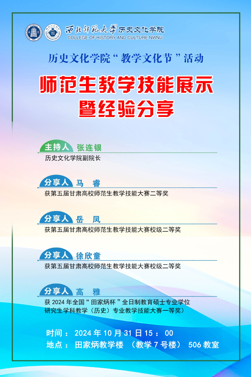分享会上,学科(历史)教学专业硕士研究生高雅(荣获2024年全国“田家炳杯”全日制教育硕士专业学位研究生学科教学(历史)专业教学技能大赛一等奖)、历史学专业本科生马睿(荣获第五届甘肃高校师范生教学技能大赛省级二等奖)、徐欣童(荣获第五届甘肃高校师范生教学技能大赛校级二等奖)、岳凤(荣获第五届甘肃高校师范生教学技能大赛校级二等奖)四名同学从教学设计撰写、课件制作、模拟授课、师范生教学能力提升、教学技能大赛参赛经验等方面分享了心得体会。
