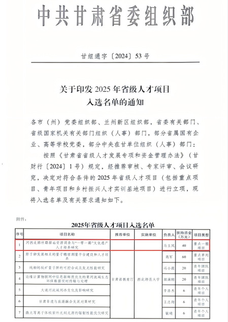近日,2025年甘肃省人才项目入选名单公布,欧博abg官方网站共有7个项目入选,获得项目资助金158万元。欧博abg官方网站(中亚研究院)马玉凤教授申报的“河西走廊丝路驿站资源调查与‘一带一路’文化遗产人才培养研究” 获批甘肃省重点人才项目,项目经费40万元。